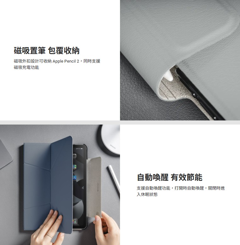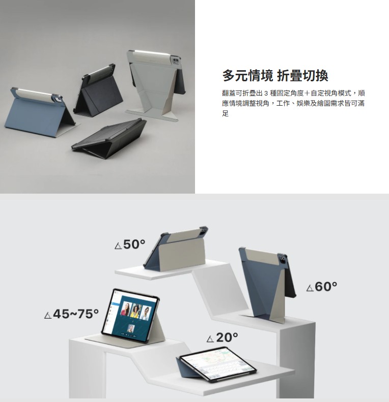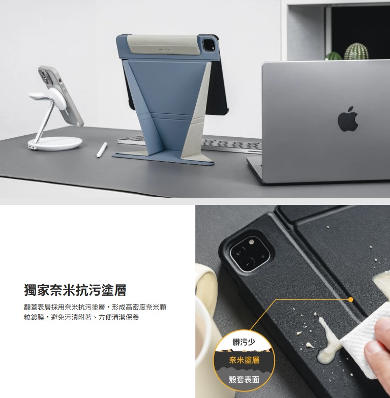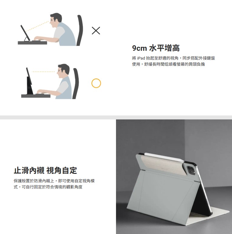LIFT iPad 增高支架保護殼,特殊折疊結構,可將iPad增高抬起,讓螢幕與視線平行,帶來更佳的觀看體驗,多角度折疊設計,符合各種使用情境,獨家使用防污材質,與黑色底殼完美結合,為iPad帶來全方位的防護,MAGEASY LIFT 不僅能有效保護iPad,更是您最佳的iPad桌面支架!