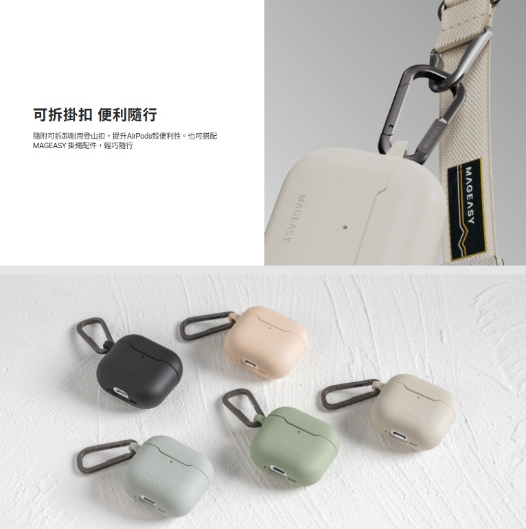 6. 隨附可拆卸耐用登山扣,提升AirPods殼便利性。也可搭配 MAGEASY 掛繩配件,輕巧隨行